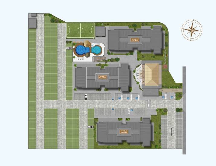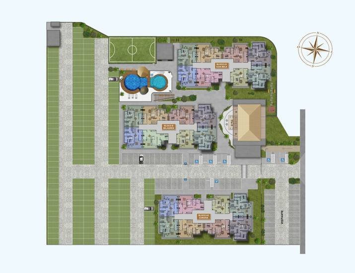 Quanto ao Green Village temos como características gerais: 3 torres, 8 apartamentos por andar, térreo mais 7 pavimentos, 192 apartamentos sendo 1 coluna de apartamentos com 2 quartos PNE's, com apartamentos de 1, 2 e 3 quartos com suíte e varanda Gourmet, conta ainda com os Térreos com Jardim, 2 elevadores por torre, área de lazer completa e equipada. Tamanhos de 57,60m2 a 71,45m2